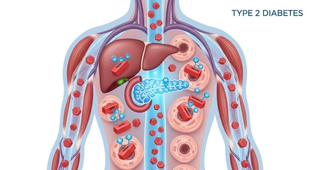 Glucose is the primary fuel for the body. When it cannot enter cells efficiently, it remains in the bloodstream, damaging blood vessels, nerves, and organs. Type 2 Diabetes is not just a blood sugar problem—it is a whole‑body condition affecting the heart, kidneys, eyes, brain, and immune system.